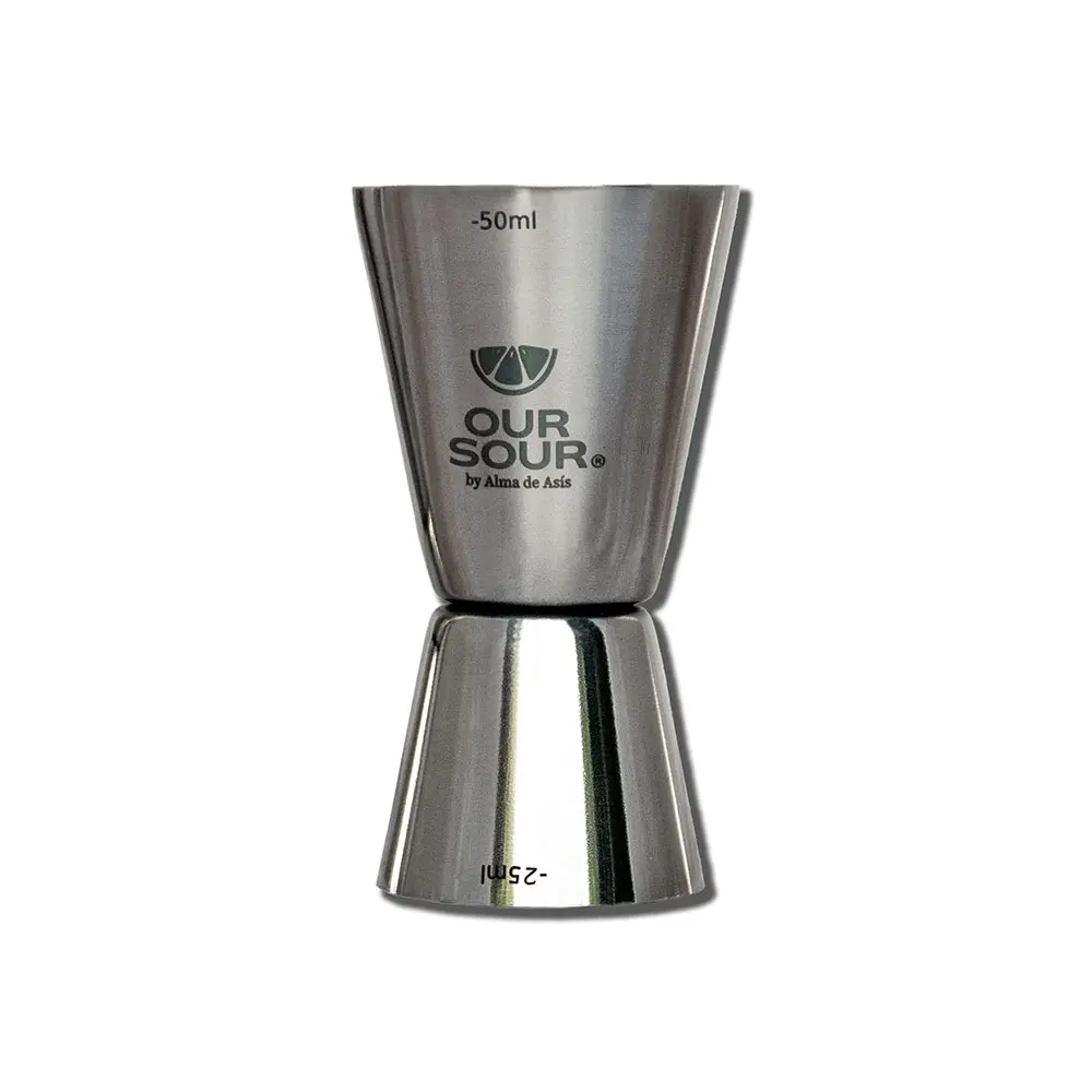 Jigger de acero inoxidable con capacidad de 60/30 ml y marcas grabadas en 50 ml y 25 ml, diseñado para facilitar la preparación de cócteles Our Sour.