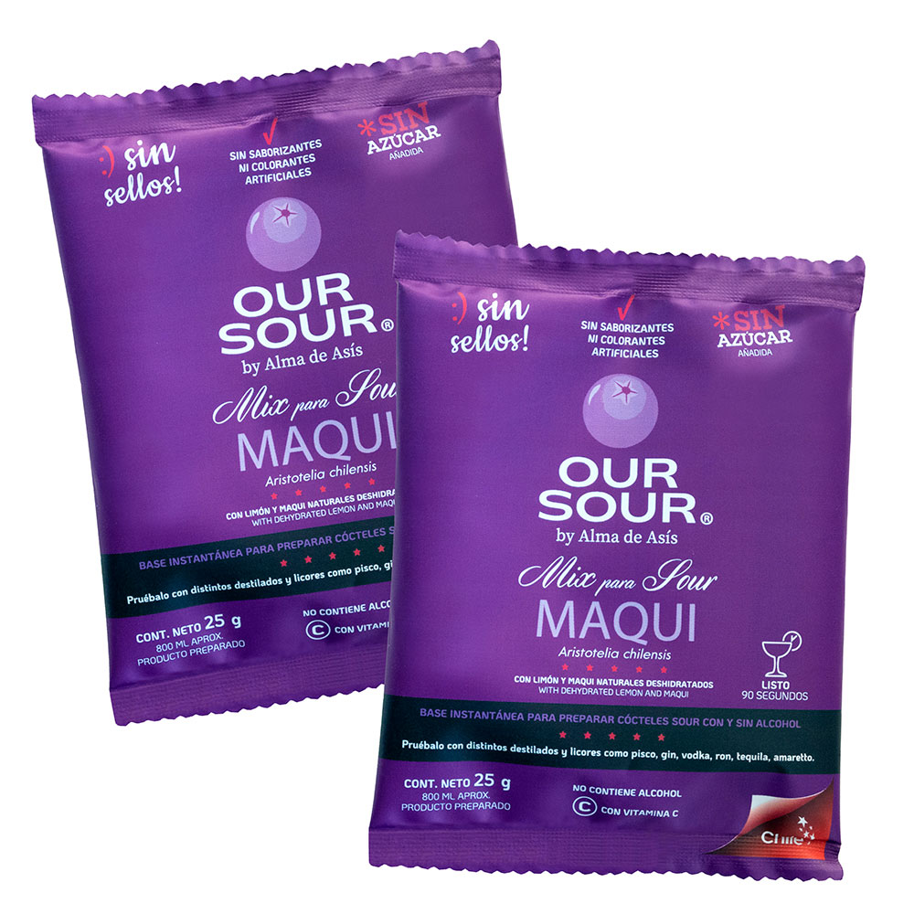 Perfectos para disfrutar un atardecer. Our Sour es una base instantánea para preparar cócteles o mocktails sour sabor maqui. Tiene el dulzor perfecto, pero sin azúcar añadida, libre de sellos, sin saborizantes ni colorantes artificiales y con fruta natural deshidratada.